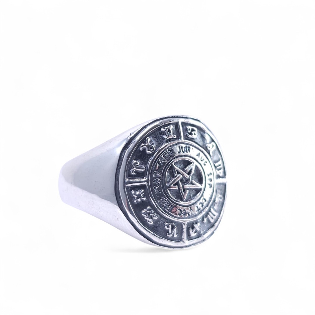 Siegel-Ring mit Sternzeichenkalender und Pentagramm aus Sterling Silber.