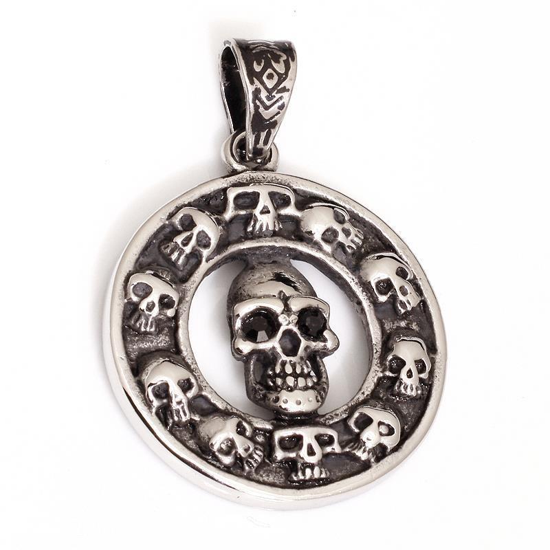 Edelstahlanhänger mit Totenkopd und schwarzen Glitzersteinchen.