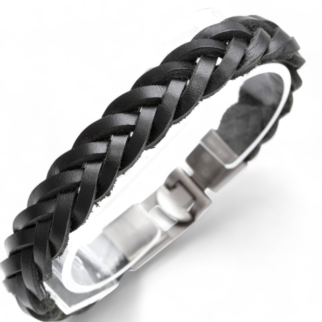 Geflochtenes Lederarmband mit einer Schließe aus Metall.
