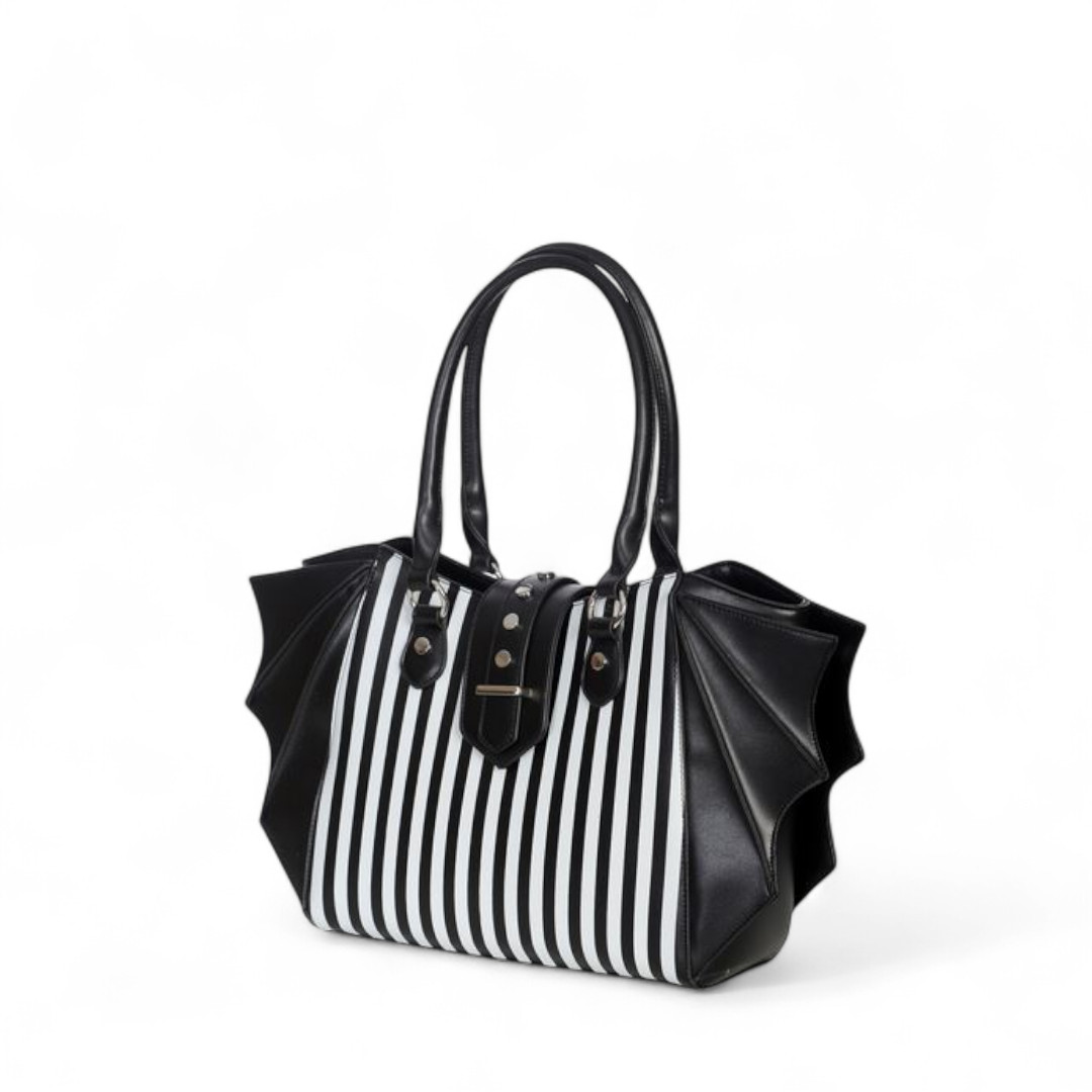 Handtasche im Striped-Look mit angedeuteten Fledermausflügeln.