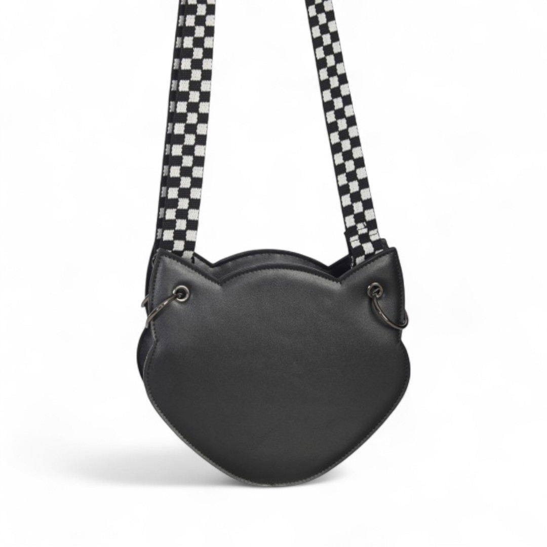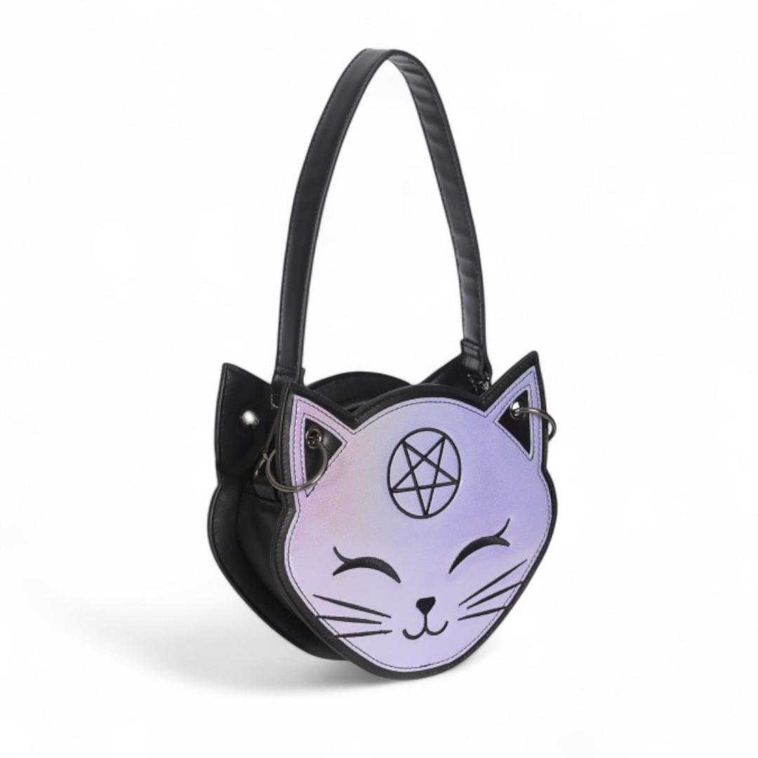 Umhängetasche in cuter Katzenform in Lila-Metallic.