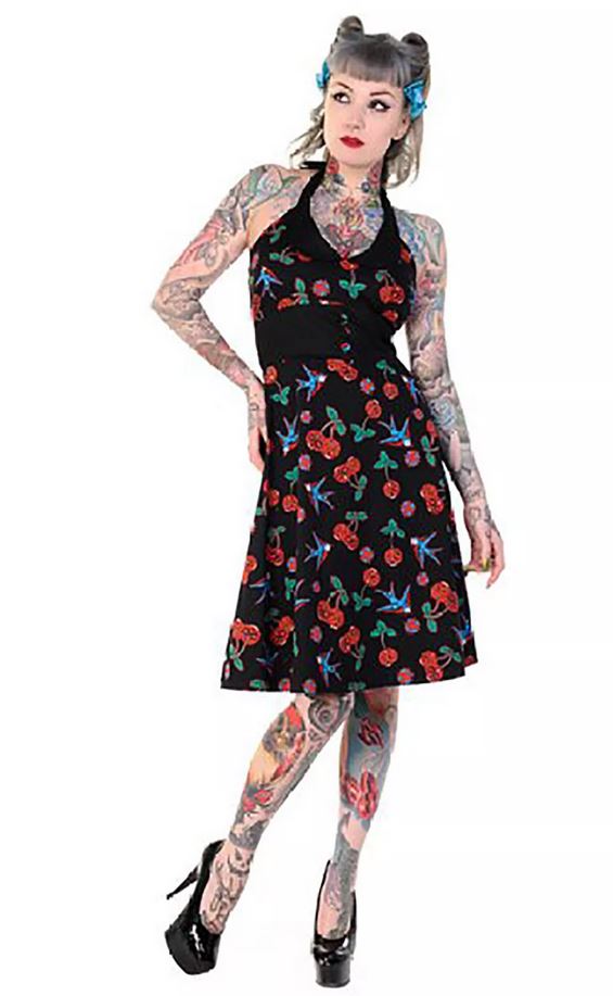 Rockabilly Neckholder Kleid mit Oldschool Schwalben und Kirschen Motiv
