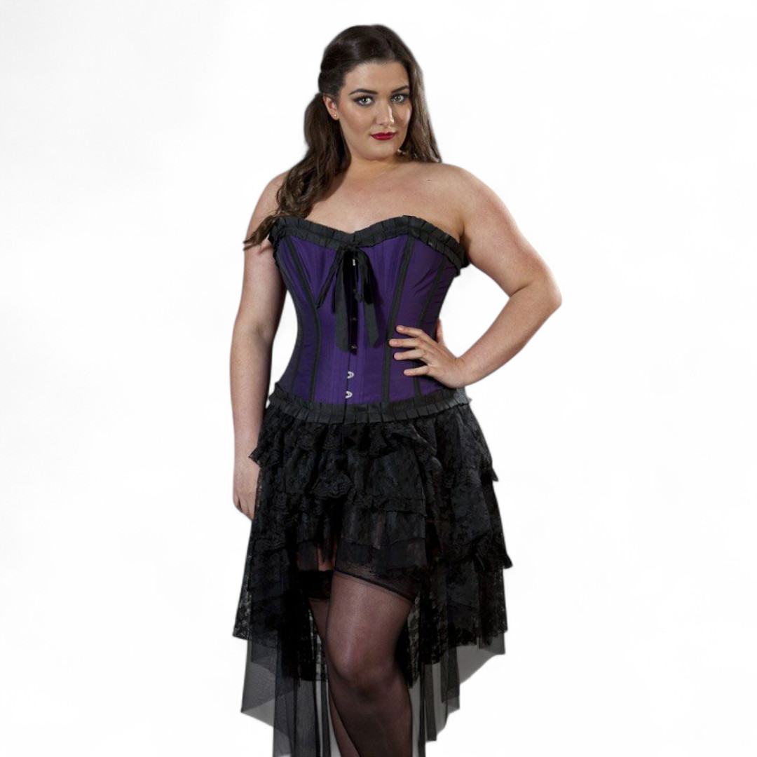 "Lily" Überbrust-Burlesque-Korsett aus lila Taft mit schwarzen Paspeln und Rüschen.