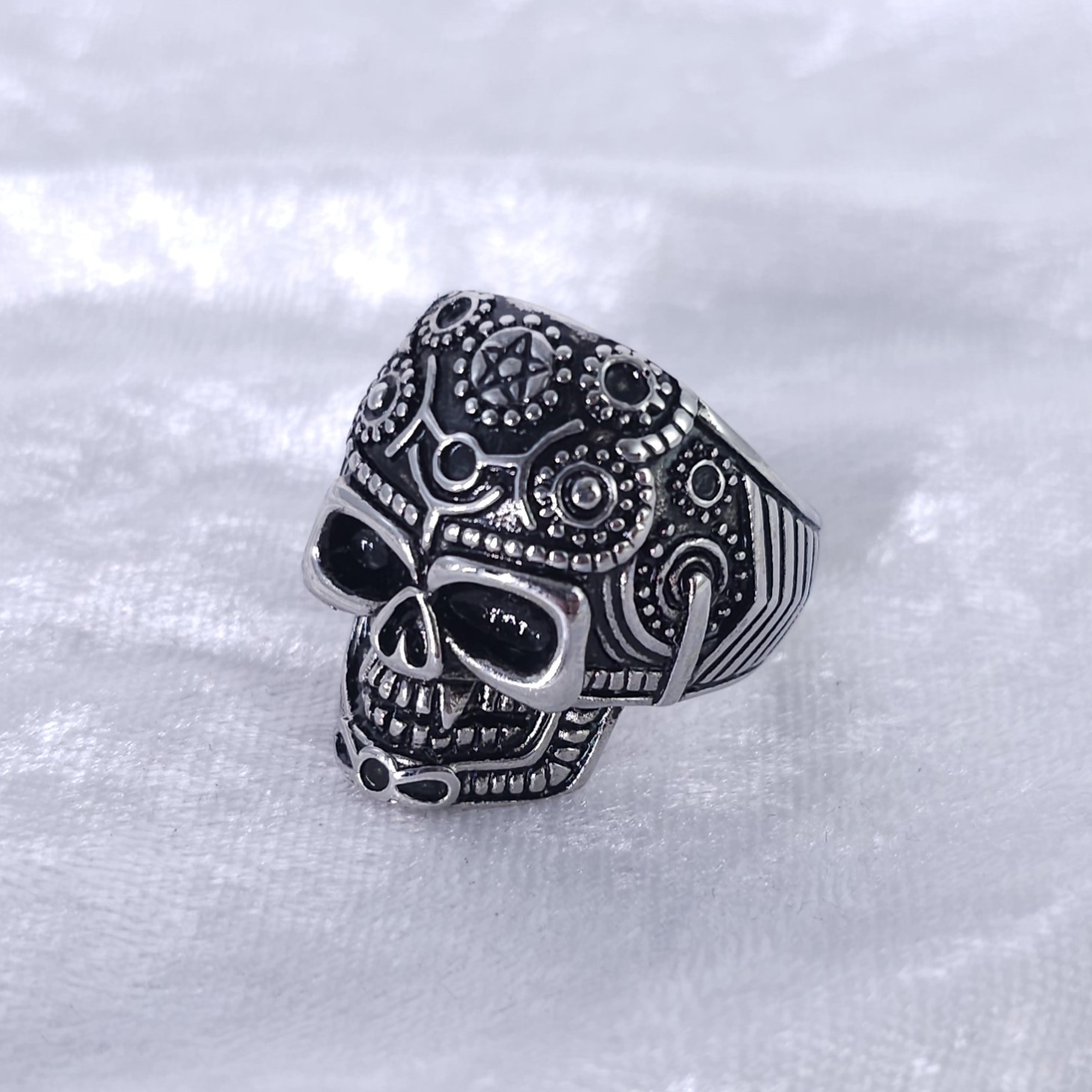 Edelstahlring in Totenkopf-Form mit eingraviertem Pentagramm.