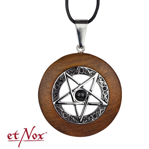 etNox-Anhänger aus Holz und Edelstahl mit einem Pentagramm und Schmuckstein in der Mitte.