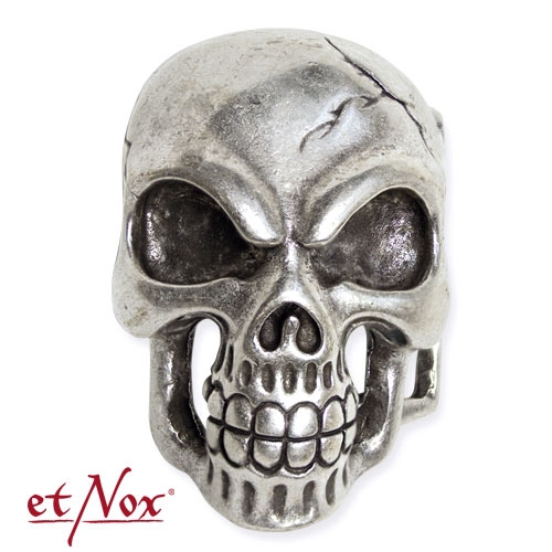 Handgearbeitete Gürtelschnalle von etNox in Totenkopfform.