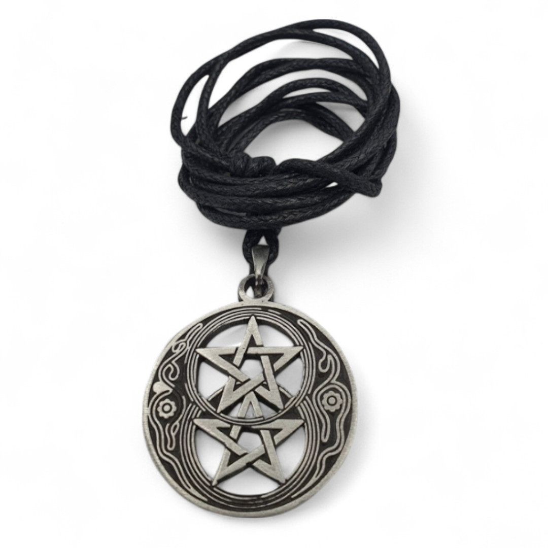 Kunstleder-Band mit Zinnanhänger und einem doppeltem Pentagramm als Motiv.