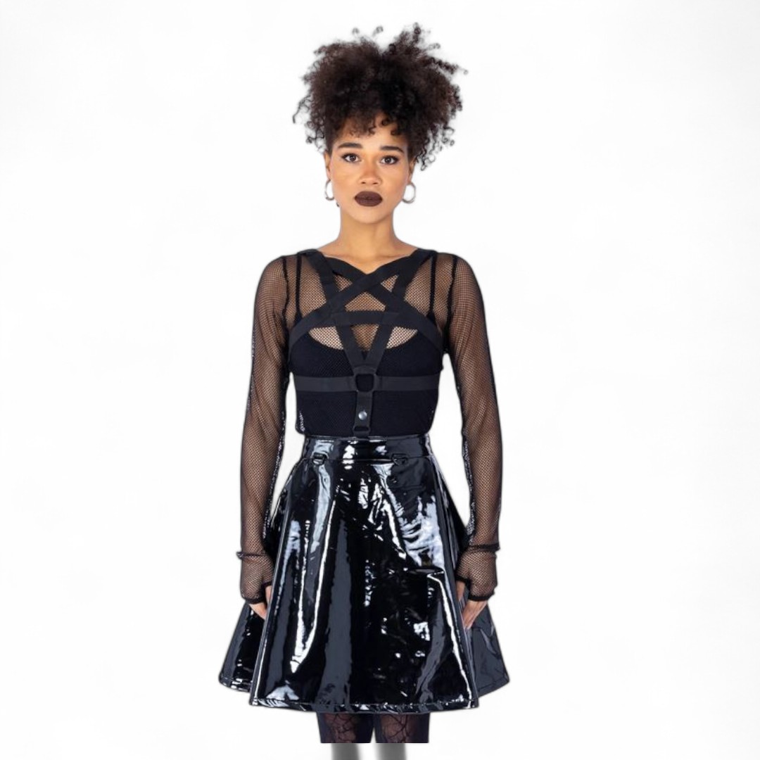 Midi-Faltenrock aus glänzendem Lack-Vinyl.