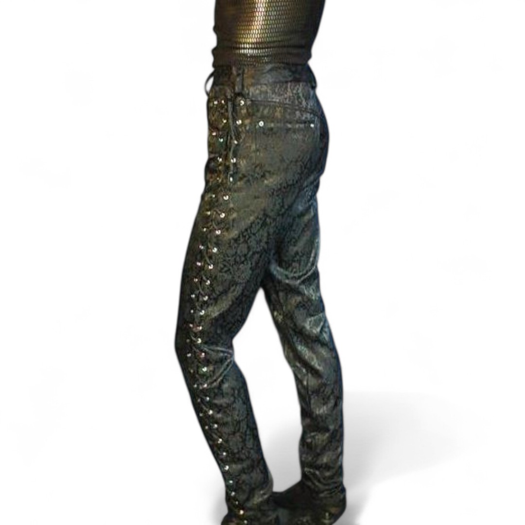 Elegante Hose aus Jaquard-Brokat Stoff mit seitlichen Schnürungen und sichtbaren silbernen Nieten.