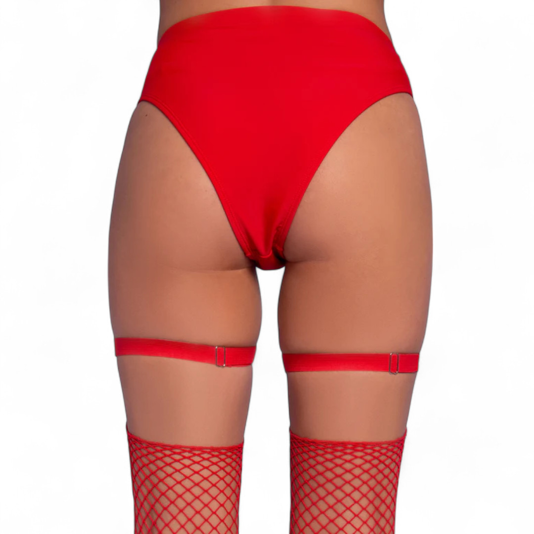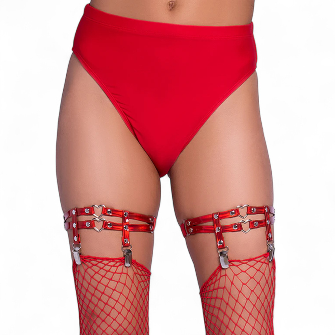 Vervollständigen deinen sexy Look mit diesen Strumpfbändern mit schillernden roten Nieten.