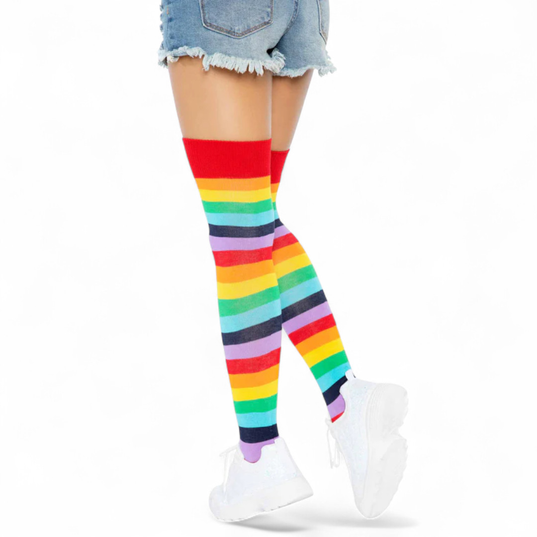 Bringe mit den Rainbow Thigh High Socks von Leg Avenue Farbe in deinen Tag.