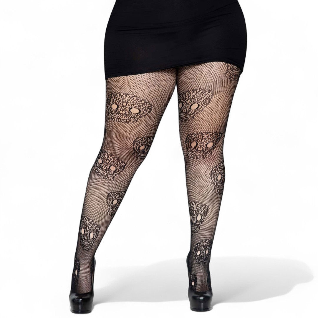 Netzstrumpfhose mit Totenköpfen aus Spitze