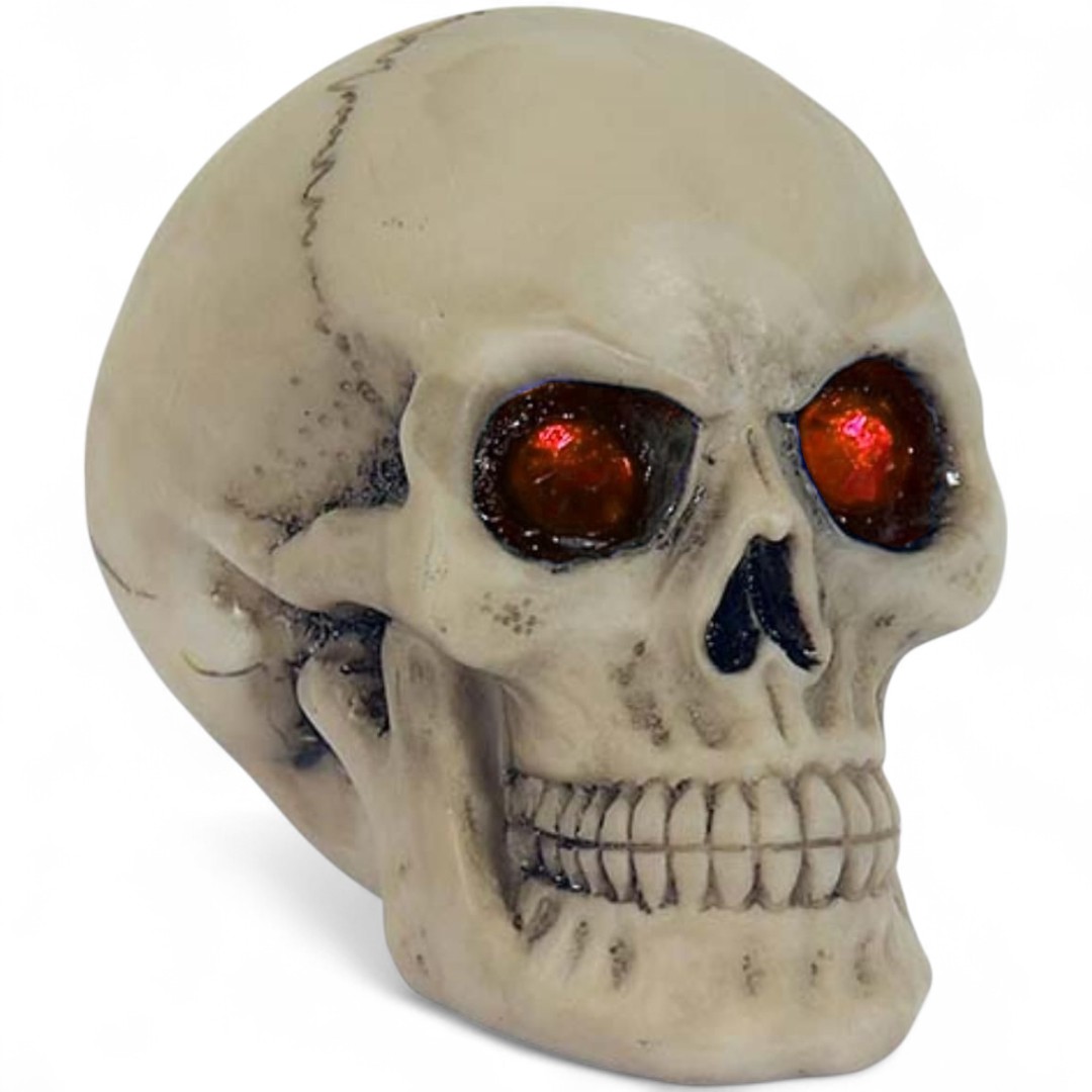 Dekorative Totenschädelfigur mit roten Glitzersteinen als Augen.