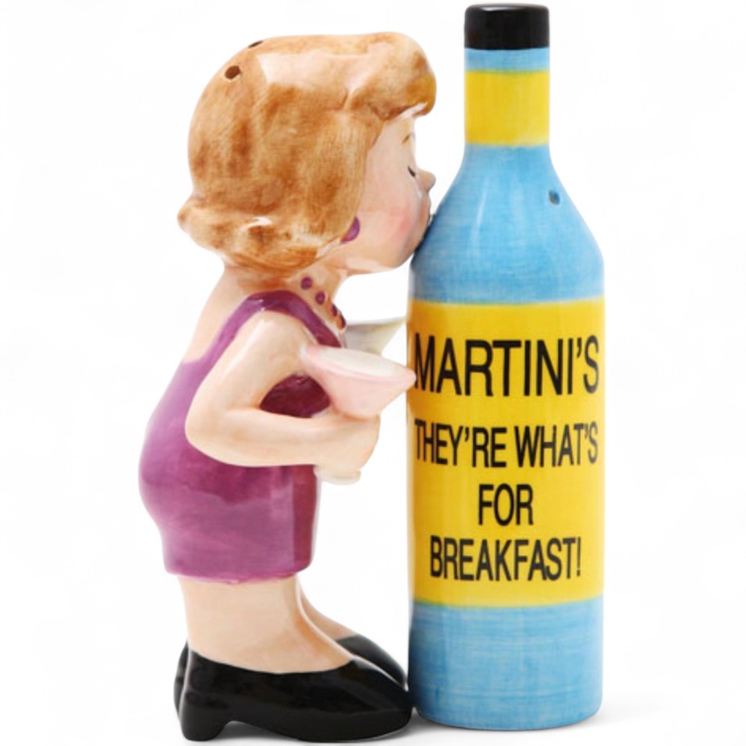 Salz- und Pfefferstreuer mit Frau und Martini’s Flasche.