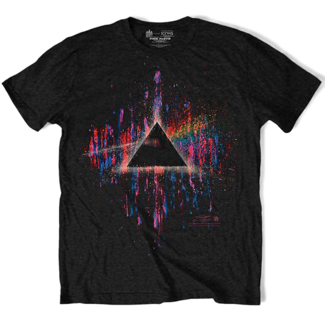 Ein offiziell lizenziertes Pink Floyd Unisex-T-Shirt mit dem Designmotiv „Dark Side of the Moon Pink Splatter“.