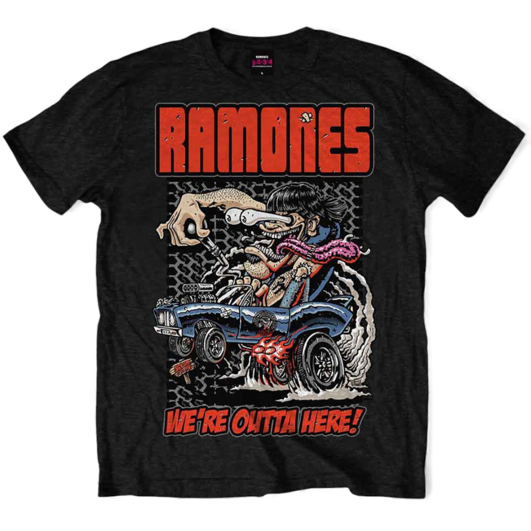 Ein offiziell lizenziertes Ramones-Unisex-T-Shirt mit dem Designmotiv „Outta Here“. Dieses hochwertige T-Shirt ist in der Farbe Schwarz erhältlich.