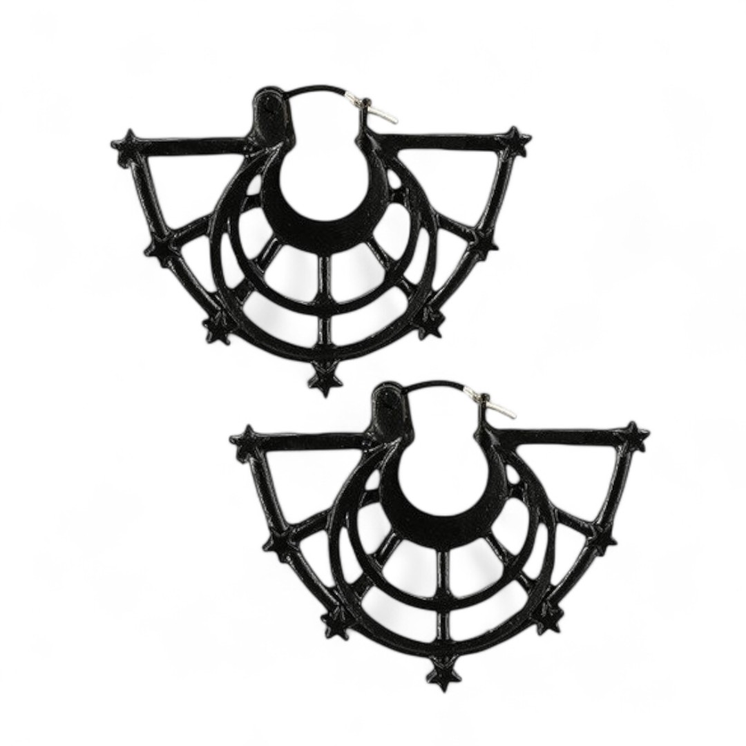 Schwarze Ohrringe in Halbkreisform mit Sternen, die an Halbmonden befestigt sind.