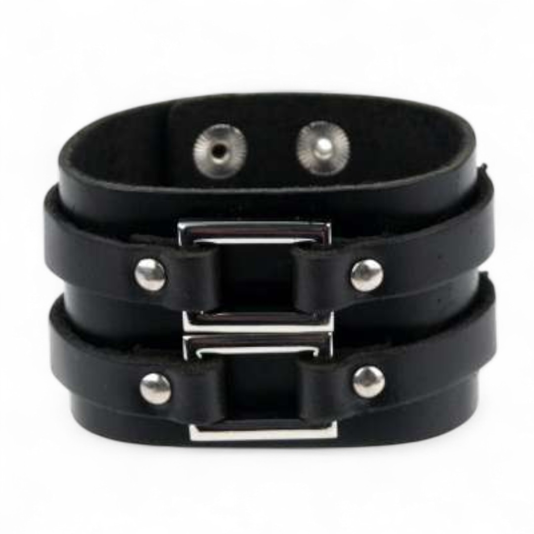 Schwarzes Lederarmband, mit zwei kleinen Schnallen.