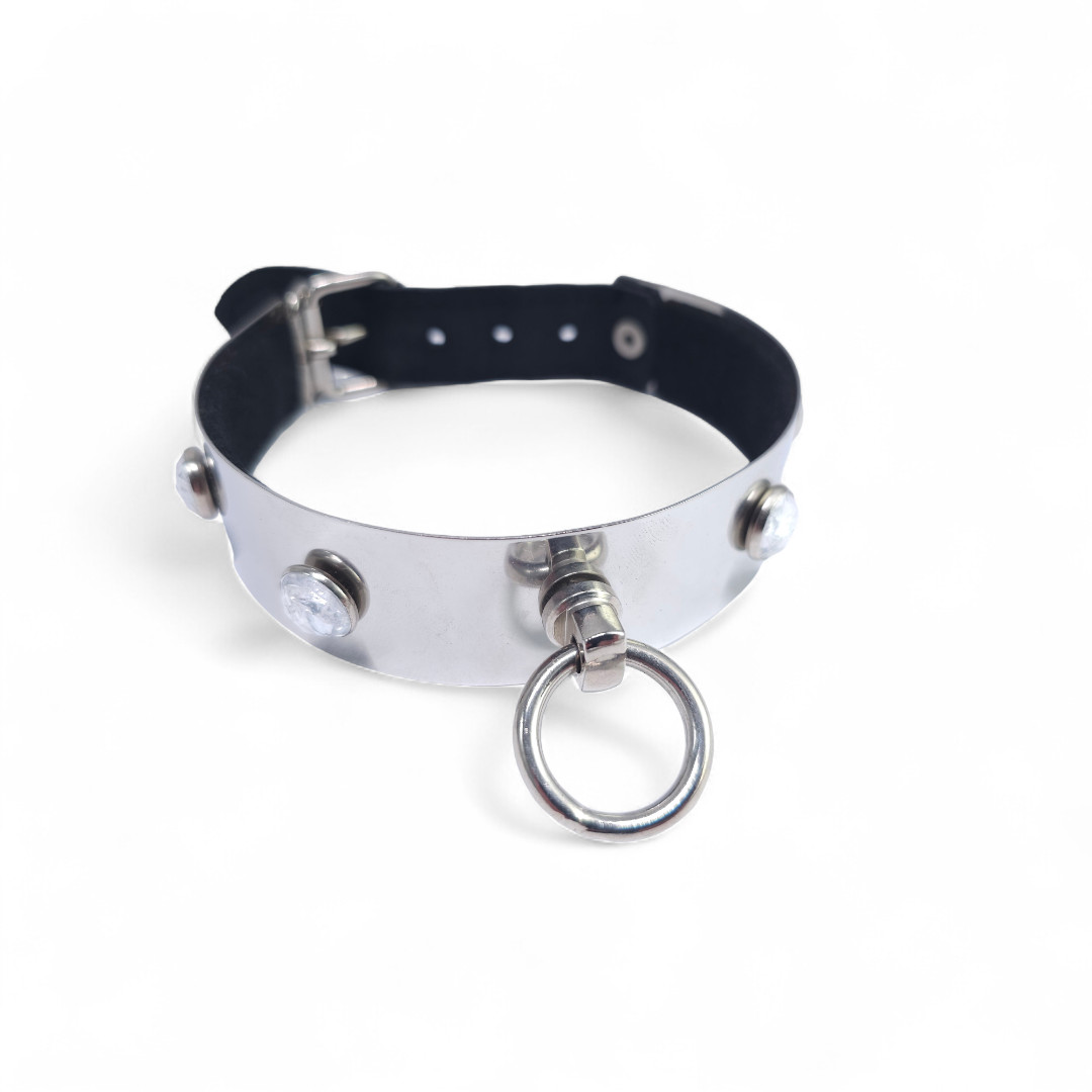 -hochwertig handgefertigt von Fetish Designer aus Ibiza -größenverstellbarer Verschluss mit Schnalle -leichtes biegbares Material -innen beschichtet für angenhemes Tragegefühl -O-Ring und vier große klare Steine   Marke: Sa Majesté Material: Edelstahl Maße: Breite 3cm , Länge 28-32cm